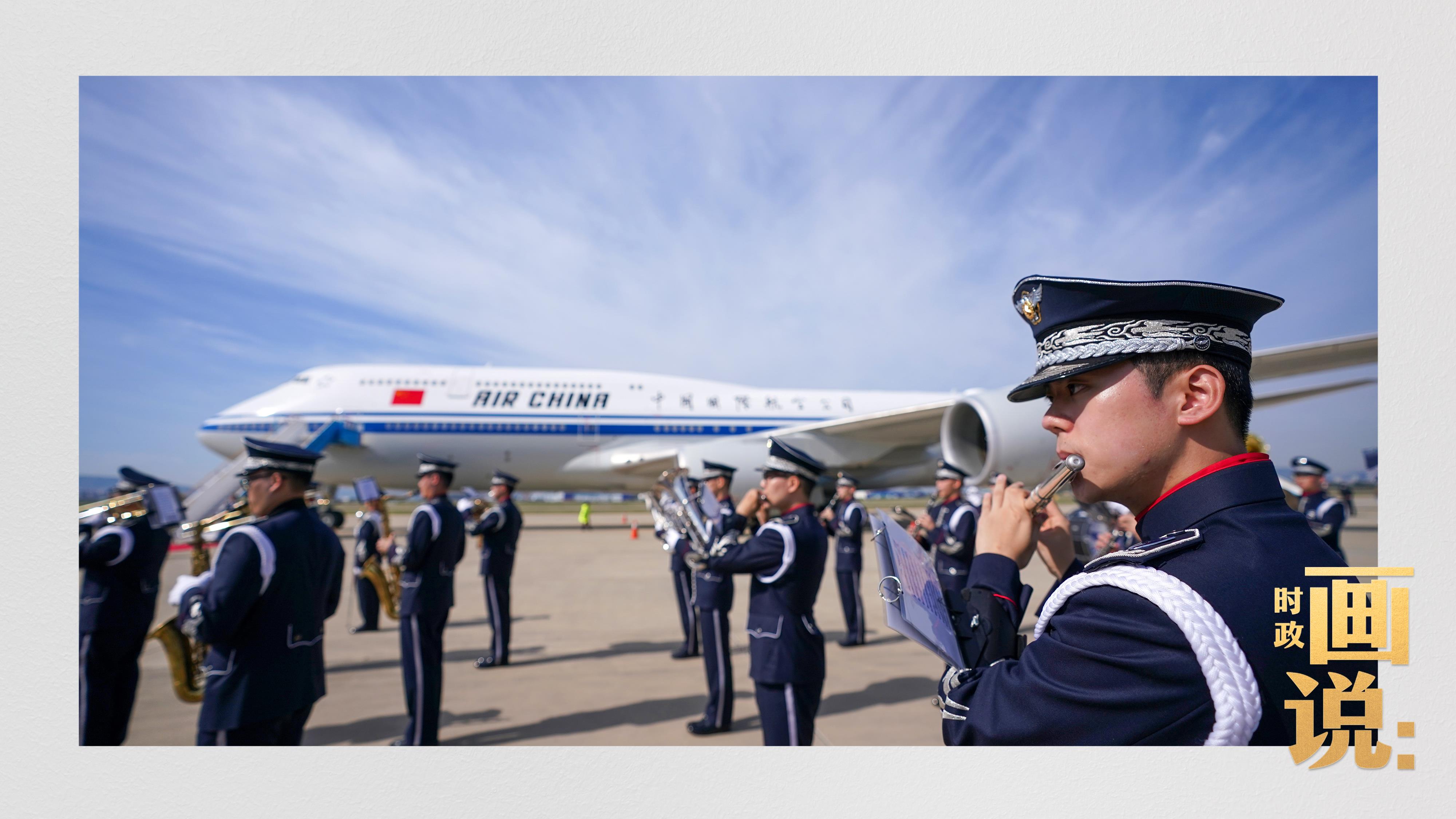 習(xí)近平抵達(dá)釜山金海國(guó)際機(jī)場(chǎng)時(shí),韓國(guó)外長(zhǎng)趙顯等高級(jí)官員熱情迎接。禮兵分列紅地毯兩側(cè)致敬,軍樂(lè)團(tuán)演奏行進(jìn)樂(lè),機(jī)場(chǎng)鳴放21響禮炮。