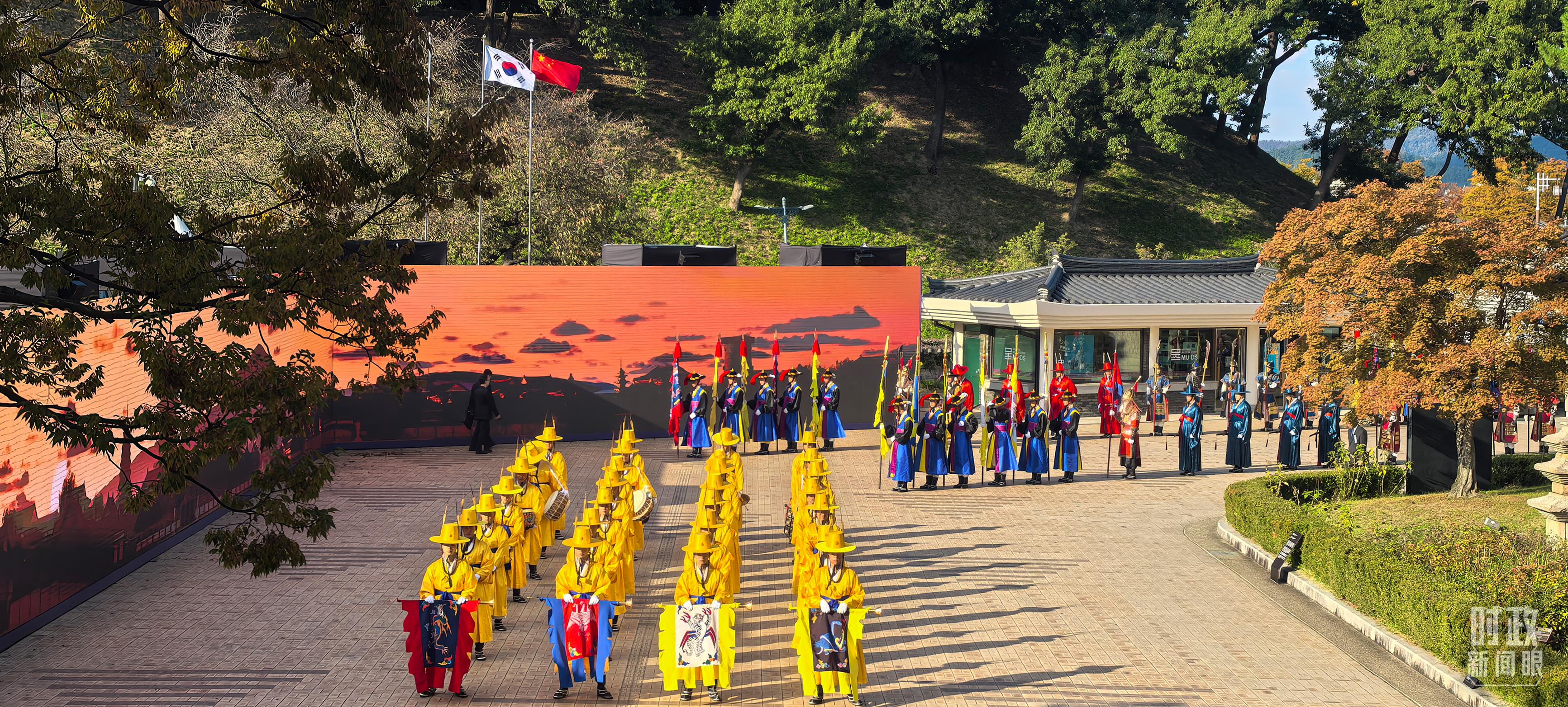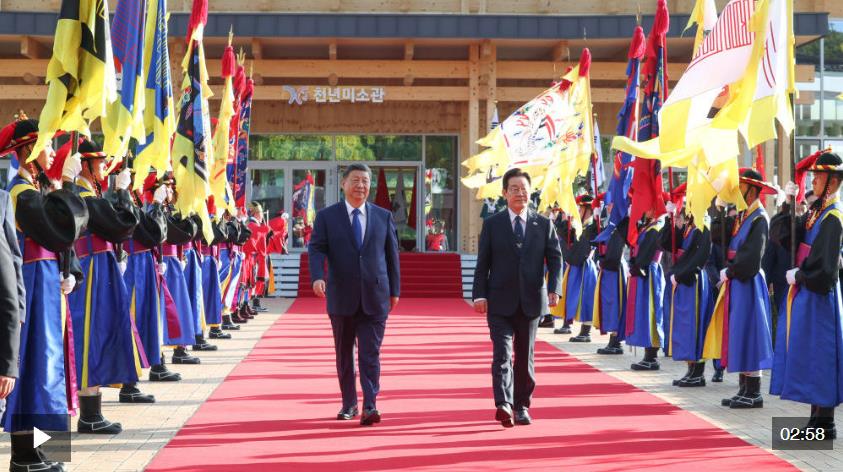 在慶州博物館的千年微笑館,李在明總統(tǒng)為習(xí)主席舉行高規(guī)格歡迎儀式,身著傳統(tǒng)民族服飾的韓國(guó)禮儀隊(duì),隆重歡迎習(xí)主席到來(lái)。