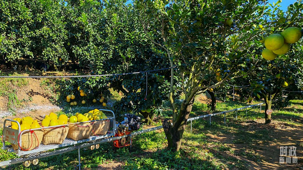 △金柚采摘運(yùn)送用上了無人軌道車,可大大減輕人力負(fù)擔(dān)。(總臺(tái)央視記者郭鴻拍攝)
