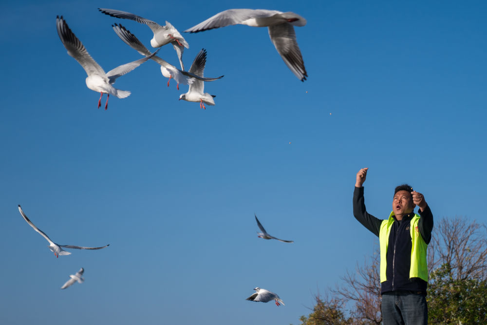 2024年12月11日,志愿者張利云在云南昆明王官濕地公園投喂紅嘴鷗。志愿者張利云堅(jiān)持投喂紅嘴鷗長達(dá)十余年,為生態(tài)環(huán)境保護(hù)貢獻(xiàn)個人力量。