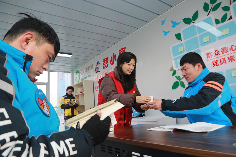 2023年12月27日,志愿者在山東省高密市密水街道“憩小亭”服務(wù)站為外賣騎手送上熱水。入冬以來,山東省高密市密水街道推進(jìn)“憩小亭”暖心服務(wù)站建設(shè),為外賣騎手、快遞小哥、網(wǎng)約車司機(jī)、環(huán)衛(wèi)工人等戶外勞動者提供飲水、無線上網(wǎng)、食物加熱等多項(xiàng)服務(wù),讓他們感受到冬日里的溫暖。