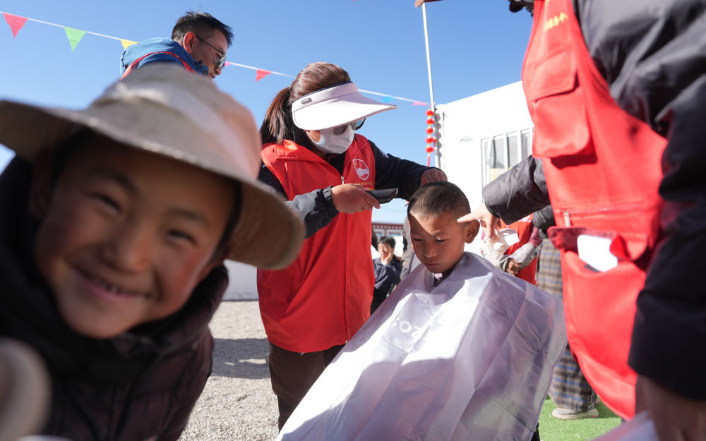 2025年1月26日,志愿者在西藏拉孜縣吉如村安置點(diǎn)為孩子們理發(fā)。西藏定日縣6.8級地震發(fā)生后,志愿者們迅速參與救援搜救、協(xié)助搭建帳篷、搬運(yùn)賑濟(jì)物資、協(xié)調(diào)村民所需。數(shù)百名大學(xué)生組成志愿者服務(wù)隊(duì),白天為安置點(diǎn)的孩子們輔導(dǎo)作業(yè)、陪孩子們運(yùn)動;晚上組成巡邏隊(duì),守護(hù)安置點(diǎn)的安寧。