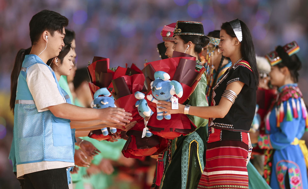 2024年11月30日,五十六個民族代表在海南三亞舉行的第十二屆全國少數(shù)民族傳統(tǒng)體育運(yùn)動會閉幕式上為志愿者獻(xiàn)花。運(yùn)動會期間,數(shù)千名志愿者“小鹿鹿”奔赴十余個競賽場館、二十多家接待酒店、媒體中心、機(jī)場車站等地,為來自全國各地的運(yùn)動員、技術(shù)官員、工作人員和觀眾提供禮賓接待、交通引導(dǎo)、安全保衛(wèi)等志愿服務(wù)。