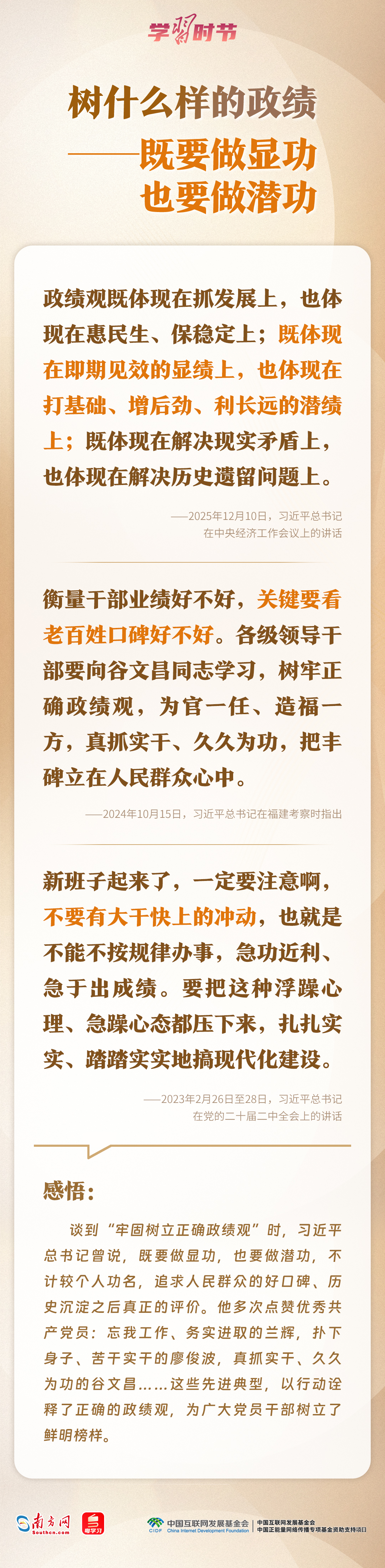黨的十八大以來(lái),習(xí)近平總書(shū)記對(duì)樹(shù)立和踐行正確政績(jī)觀作出一系列重要論述,深刻闡明了“政績(jī)?yōu)檎l(shuí)而樹(shù)、樹(shù)什么樣的政績(jī)、靠什么樹(shù)政績(jī)”等重大問(wèn)題,為廣大黨員干部提供了重要遵循。一起來(lái)學(xué)習(xí)感悟。