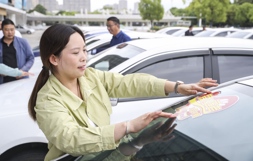 2023年高考期間,江蘇省淮安市開展“愛心送考”志愿者服務(wù)活動,組織愛心司機(jī)在高考期間為考生提供送考服務(wù)。這是淮安市一名網(wǎng)約車司機(jī)在車輛上張貼“愛心送考”標(biāo)識。