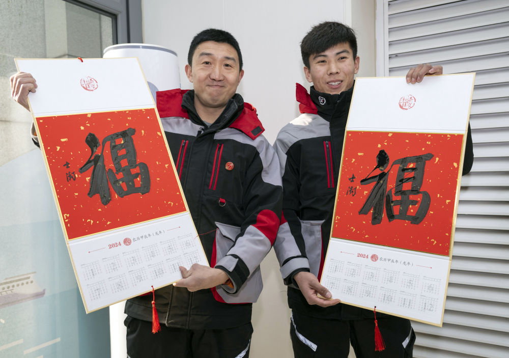 2024年1月16日,在北京的中國職工之家工會驛站舉行的萬福迎春——2024年“送萬福、進(jìn)萬家”書法公益活動上,快遞小哥展示福字。