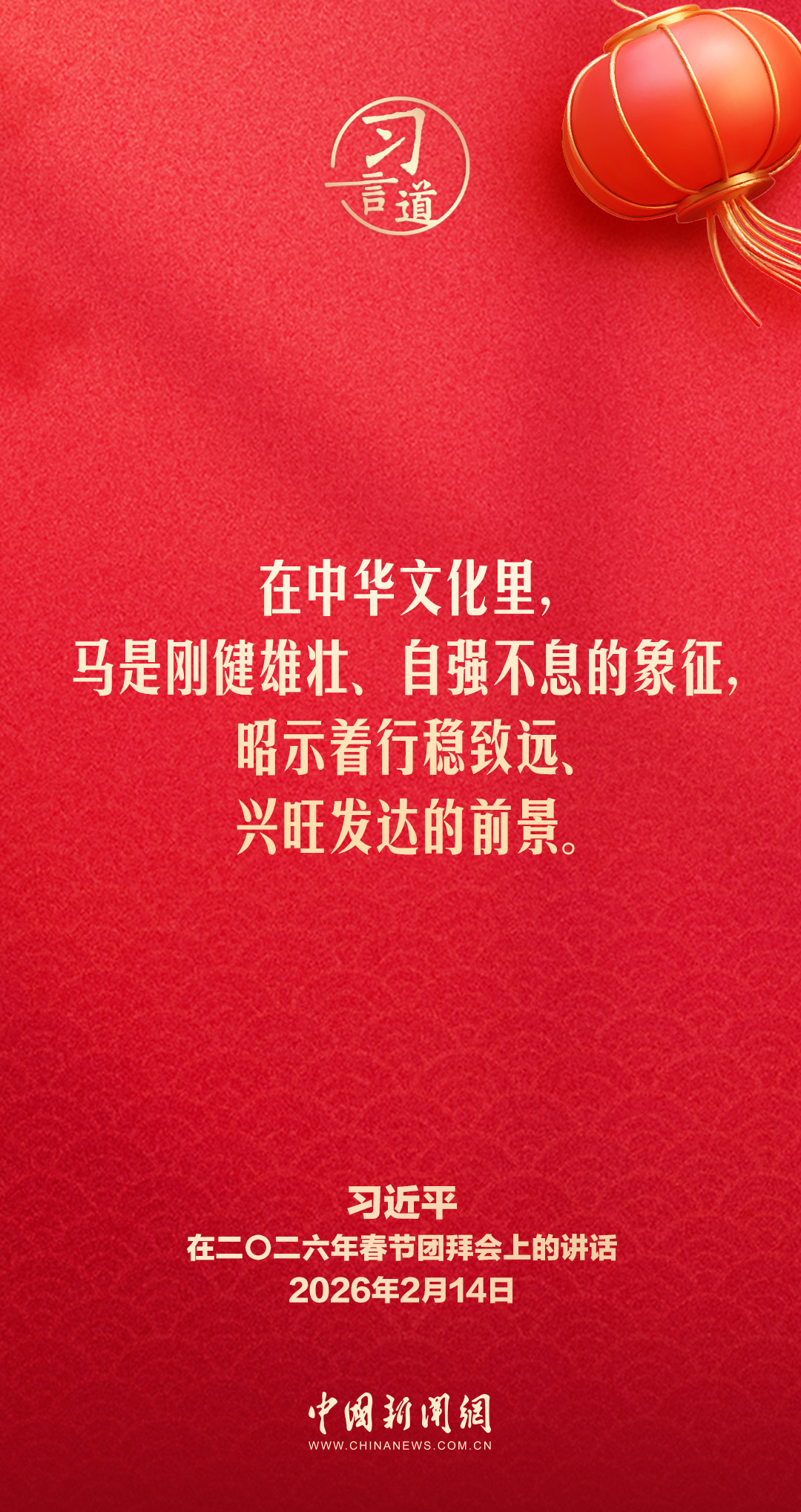 2月14日,中共中央、國(guó)務(wù)院在人民大會(huì)堂舉行2026年春節(jié)團(tuán)拜會(huì)。中共中央總書記、國(guó)家主席、中央軍委主席習(xí)近平發(fā)表講話,代表黨中央和國(guó)務(wù)院,向全國(guó)各族人民,向香港特別行政區(qū)同胞、澳門特別行政區(qū)同胞、臺(tái)灣同胞和海外僑胞拜年。他指出——