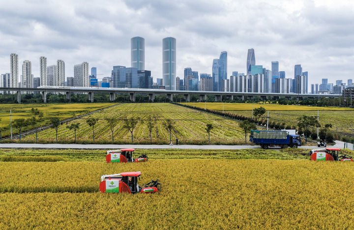 收割機(jī)在位于浙江杭州蕭山區(qū)世紀(jì)田園糧食功能區(qū)的稻田里收割水稻,遠(yuǎn)處高鐵列車飛馳而過(2025年10月21日攝,無人機(jī)照片)。新華社記者 徐昱 攝