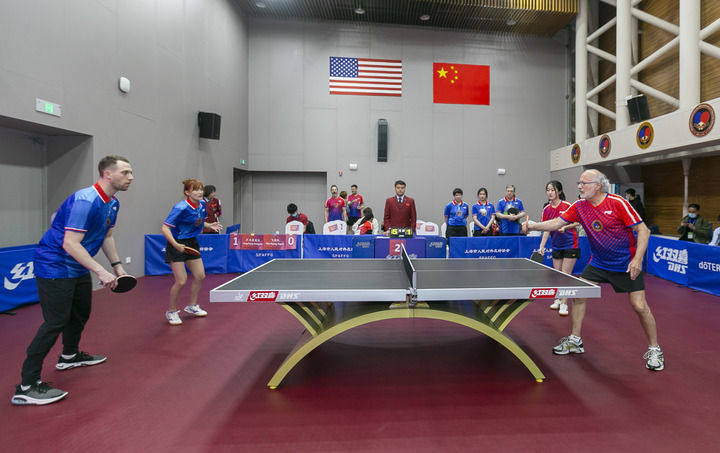 2021年4月10日,上海舉行紀念中美“乒乓外交”50周年系列活動。這是中美選手參加乒乓球友誼賽。新華社記者 王翔 攝