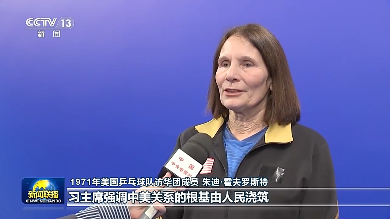 1971年美國乒乓球隊訪華團成員 朱迪·霍夫羅斯特:習主席強調(diào)中美關系的根基由人民澆筑,這一點我深有感觸。在當下,相互理解與對話比任何時候都更加重要,我也希望我們能將“乒乓外交”精神繼續(xù)傳承,在兩國人民間傳遞溫情,增進理解。