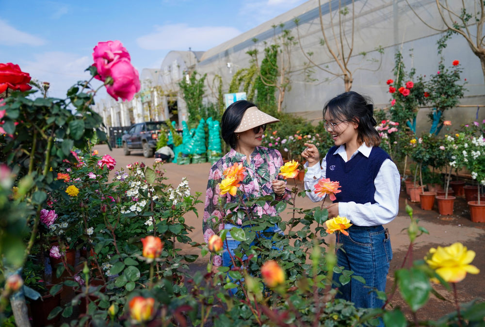 2025年4月11日,越南花商阮翠云(左)與翻譯李青歌在云南昆明斗南一花卉基地內查看鮮花品質。2018年,阮翠云開始在越南銷售云南花卉,讓七彩“云花”成為眾多越南家庭的“??汀薄=柚咝У碾娚唐脚_和快捷的物流網絡,鮮花從云南花田到河內貨架實現了“次日達”。