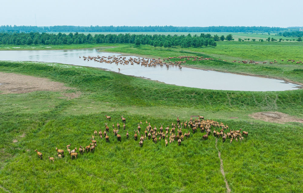 2023年5月19日,麋鹿在湖北石首麋鹿國(guó)家級(jí)自然保護(hù)區(qū)內(nèi)活動(dòng)(無(wú)人機(jī)照片)。伴隨生態(tài)環(huán)境改善,在湖北石首麋鹿國(guó)家級(jí)自然保護(hù)區(qū)、神農(nóng)架林區(qū)等多個(gè)生態(tài)屏障區(qū),麋鹿、金絲猴等野生動(dòng)物種群數(shù)量大幅增長(zhǎng)。