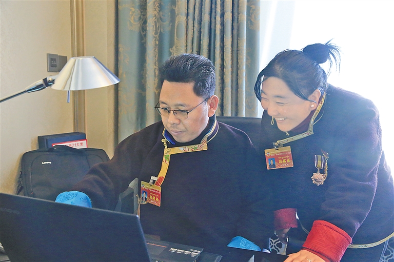 圖為西藏自治區(qū)政協(xié)委員羅布卓瑪(右)與其他委員一起討論提案。記者 馬靜 攝