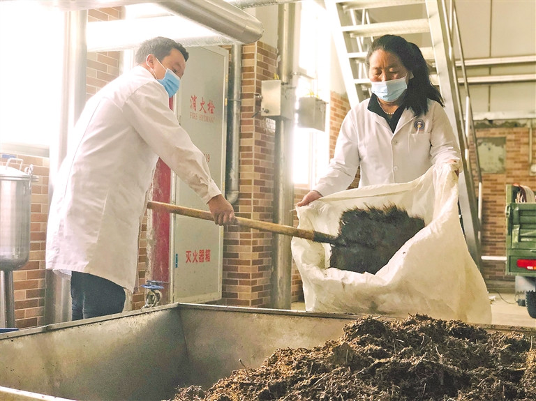西藏自治區(qū)藏醫(yī)院藏醫(yī)藥浴中心工作人員在清理藥材提取后的藥渣?! ?/p>