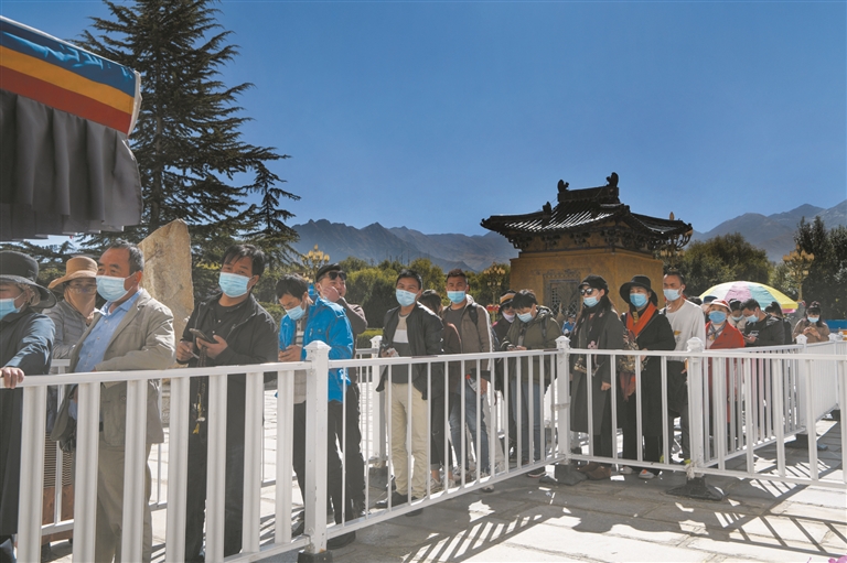 圖為游客佩戴口罩排隊(duì)進(jìn)布達(dá)拉宮參觀。記者 貢嘎來松攝