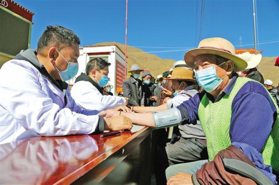 圖為志愿者為當(dāng)?shù)厝罕姕y(cè)量血壓。通訊員 倫珠次仁 記者 潘多 攝