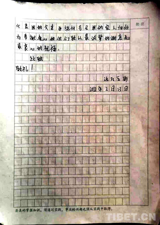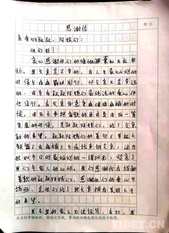中國西藏網(wǎng)訊 “親愛的叔叔、阿姨們,您們好,衷心感謝你們的慷慨解囊和無私幫助......!”近日,西藏自治區(qū)林芝市巴宜區(qū)更章門巴民族鄉(xiāng)(以下簡稱:更章鄉(xiāng))門仲村村民西繞多吉女兒達娃玉珍向更章鄉(xiāng)新時代文明實踐所發(fā)來了一封感謝信,字里行間充滿著感激之情,而背后的暖心故事更讓人溫暖與感動。