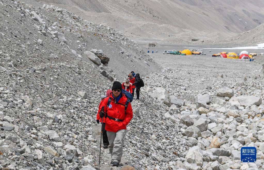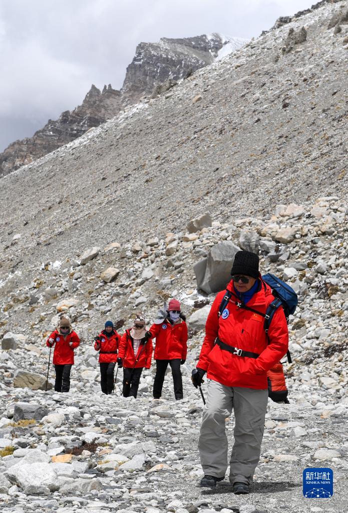 朱彤(左二)和科研人員在珠峰登山大本營和絨布冰川間徒步穿梭(5月1日攝)。新華社記者 姜帆 攝