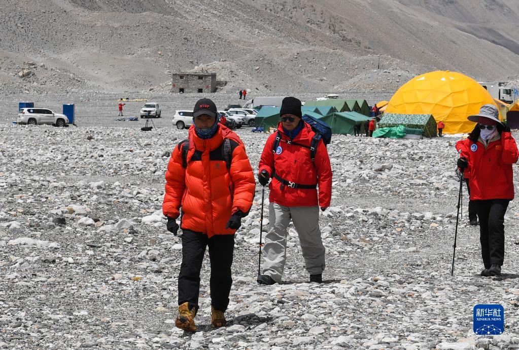 朱彤(右一)和科研人員在珠峰登山大本營和絨布冰川間徒步穿梭(5月1日攝)。新華社記者 姜帆 攝