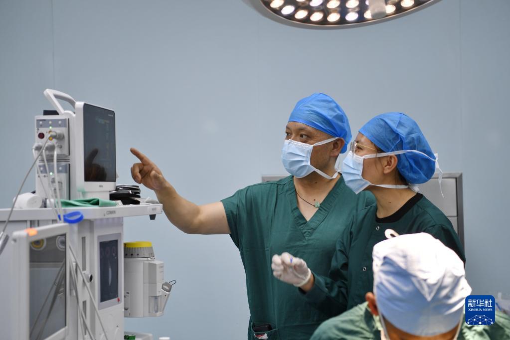 7月31日,在阿里地區(qū)人民醫(yī)院手術室,西藏自治區(qū)人民醫(yī)院麻醉科醫(yī)生達娃吾珠(左一)指導當地麻醉醫(yī)生旦增次白進行麻醉監(jiān)測。新華社記者 張汝鋒 攝