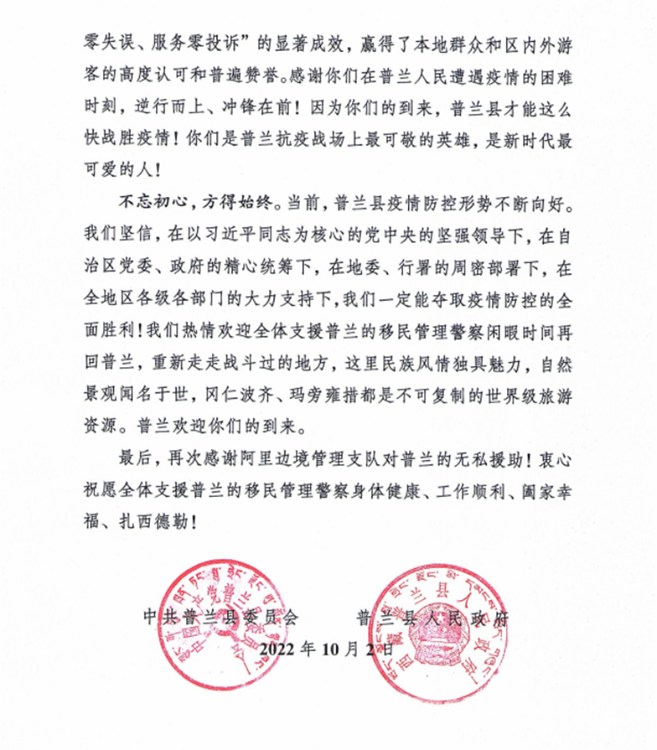中國西藏網(wǎng)訊 “普蘭縣發(fā)生新冠肺炎疫情后,阿里邊境管理支隊第一時間選派精干力量支援普蘭疫情防控工作,為打贏疫情防控阻擊戰(zhàn)、攻堅戰(zhàn)發(fā)揮了至關(guān)重要的作用?!?0月2日,西藏自治區(qū)阿里邊境管理支隊收到一封來自阿里地區(qū)普蘭縣委的感謝信。信中對阿里邊境管理支隊?wèi)?zhàn)“疫”一線民警在一個多月的疫情防控工作中,克服困難、勇于擔(dān)當(dāng)、不分晝夜、持續(xù)奮戰(zhàn)的抗疫工作表達(dá)了感謝,給予了肯定。