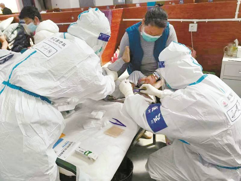 圖為浙江援藏醫(yī)療隊(duì)醫(yī)護(hù)人員在方艙內(nèi)對(duì)患者進(jìn)行救治。 (浙江援藏醫(yī)療隊(duì)供圖)