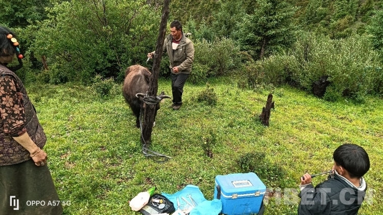 只見那頭受傷的牛被拴在木樁上,尾巴處還帶有一些血跡,顯得非常虛弱。索杰醫(yī)生先是把手術(shù)的傷口處仔細檢查了一遍,然后取來藥箱,在傷口處給藥,他告訴牧民家的男主人,?;謴偷眠€可以,不要太擔心,留下的藥是這幾天涂抹和口服的,要按時服用。