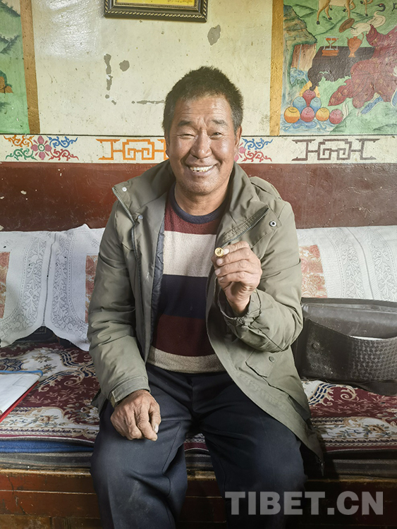索杰醫(yī)生取出第三個包的時候,格外小心翼翼。我們因此也就更好奇,里面又是什么“寶藏”?!拔?986年入黨,1997年當村大隊的副隊長。2010年,鄉(xiāng)里在12個村的大隊長中,選兩名優(yōu)秀人員,我就是其中之一?!彼鹘茚t(yī)生邊說,邊慢慢拿出一個盒子,打開盒蓋,把手在衣服角上抹抹,然后取出一枚金黃閃亮的毛主席像章?!爱敃r我們縣一共去了20人,先到那曲市委黨校學習了8天,然后到北京和大連分別參觀學習7天。在北京,我去了毛主席紀念堂、天安門、長城、鳥巢、水立方。我在天安門廣場買了鮮花,到毛主席紀念堂門口時,先是有點緊張,因為那里站崗的軍人。我把鮮花放在一個統(tǒng)一的地方,瞻仰毛主席遺容時,我緊張的心情一下子沒有了,都變成了激動?!彼鹘茚t(yī)生把手放在心臟的位置比劃著,“為了紀念毛主席,我就買了一枚毛主席像章?!?/p>