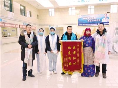 受到那曲惠民醫(yī)院救助的安多縣牧民美朵拉姆(右二)為醫(yī)院送來錦旗。 謝偉 王曉莉 攝