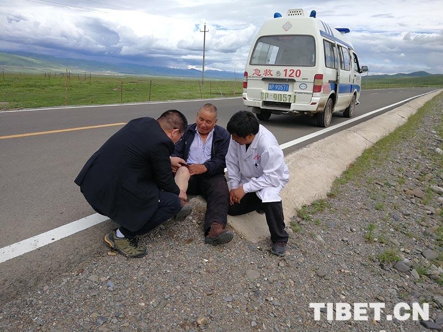 老人說自己的膝關(guān)節(jié)總是會(huì)疼,剛才在路邊站了一個(gè)多小時(shí),腫脹疼痛更加嚴(yán)重??吹竭@種情況,來自北京市昌平區(qū)醫(yī)院的骨科主任王現(xiàn)海立即在公路邊開始診治。詢問病史及進(jìn)行體格檢查后,醫(yī)生診斷為右膝關(guān)節(jié)骨性關(guān)節(jié)炎。隨后與歐拉秀瑪鄉(xiāng)衛(wèi)生院院長楊河軍及其他專家一起將老人抬上救護(hù)車,讓他躺在救護(hù)車的擔(dān)架上,進(jìn)行了腰椎及髖關(guān)節(jié)的體檢,排除了腰椎及髖部疾患的可能。王現(xiàn)海輔導(dǎo)老人進(jìn)行針對(duì)膝關(guān)節(jié)骨性關(guān)節(jié)炎的康復(fù)鍛煉,建議其口服消炎止痛類藥物,并到上級(jí)醫(yī)院進(jìn)一步檢查明確病情。老人連忙稱謝。