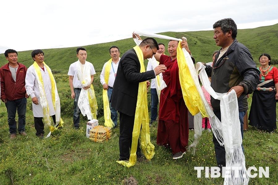 這位老人叫丹巴加,今年59歲,是這里唯一的一戶牧民。時(shí)逢放牧季節(jié),家人們趕著牛群、羊群轉(zhuǎn)場到另一個(gè)草場放牧,家中只剩下他一個(gè)人,從他家到衛(wèi)生院開車要30分鐘。老人見到我們的第一句話就是:“扎西德勒,感謝你們的到來”。