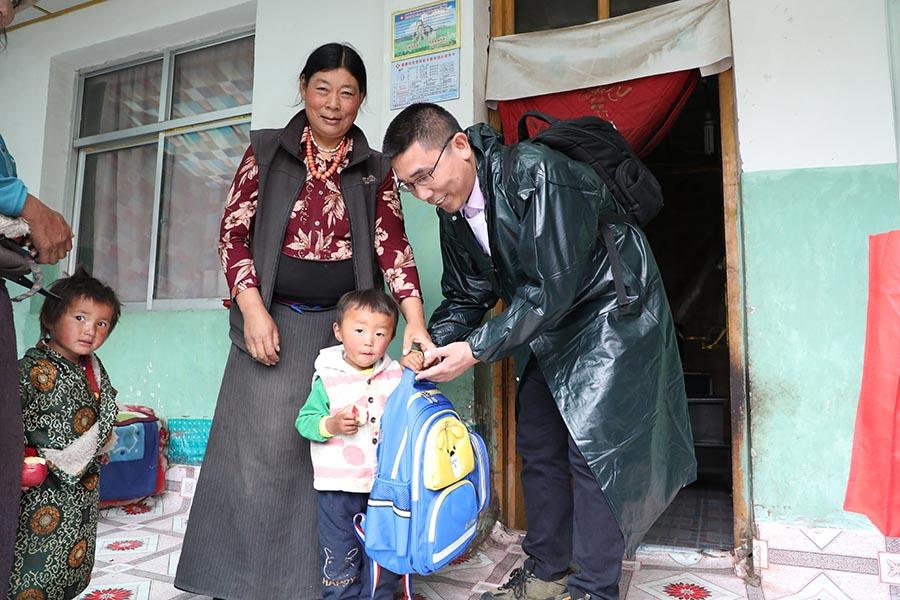 7月10日,瑪曲縣歐拉秀瑪鄉(xiāng)兩天的義診行程即將結(jié)束,王現(xiàn)海到藏族同胞家中為孩子們送上學(xué)習(xí)用品。