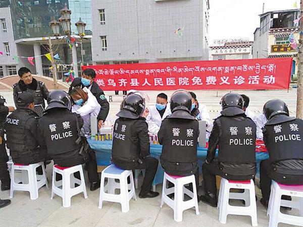 圖為類烏齊縣人民醫(yī)院醫(yī)護(hù)人員為一線執(zhí)勤公安干警進(jìn)行免費(fèi)義診現(xiàn)場(chǎng)。