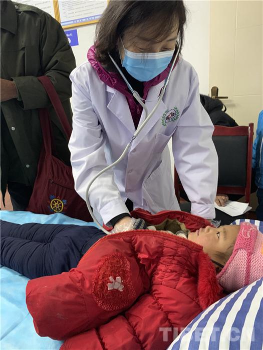 正在檢查按部就班進行時,診室內突然迎來了一位特殊的小客人,她就是之前通過“光彩o民生銀行西藏兒童先心病救治項目”接受救治的患兒旦增卓拉。旦增卓拉的家長聽說工作組來到了類烏齊縣,特意帶著孩子來請專家復查,并且想當面對工作組表示感謝。