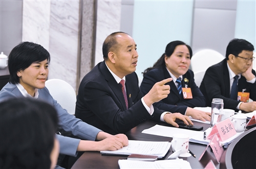 3月10日,人大河南代表團(tuán)舉行全體會(huì)議,審議外商投資法草案。會(huì)上,全國(guó)人大代表張全收(右三)就保障用工人員基本醫(yī)療衛(wèi)生服務(wù)發(fā)言。經(jīng)濟(jì)日?qǐng)?bào)-中國(guó)經(jīng)濟(jì)網(wǎng)記者李景錄攝