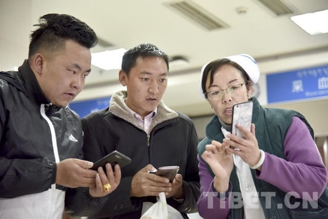 圖為西藏自治區(qū)人民醫(yī)院工作人員正在指導(dǎo)前來就診的群眾使用手機微信掛號。