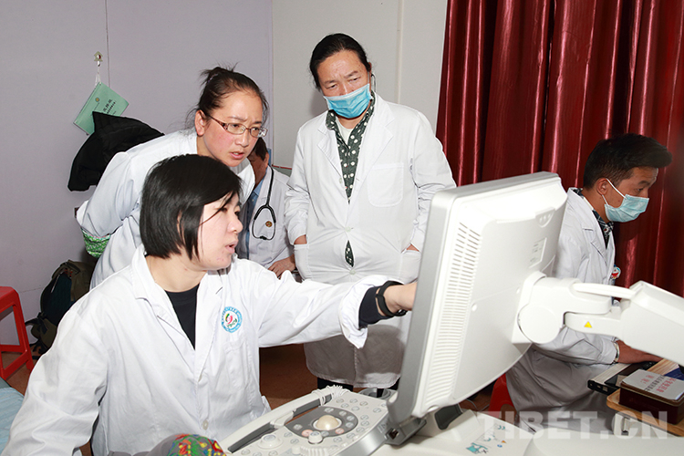 圖為李蕾在超聲檢查過(guò)程中向當(dāng)?shù)蒯t(yī)護(hù)人員講解相關(guān)知識(shí) 攝影:陳衛(wèi)國(guó)