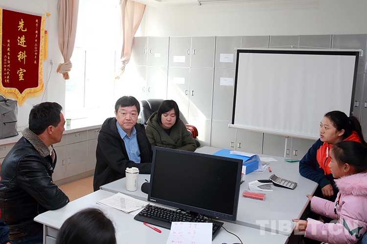 圖為王非(左二)向符合救助要求的患兒家屬講解手術(shù)治療的相關(guān)注意問(wèn)題 攝影:陳衛(wèi)國(guó)