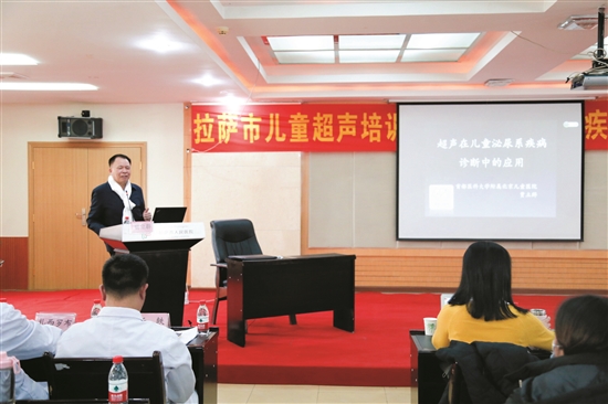 近日,拉薩市人民醫(yī)院舉行兒童泌尿系統(tǒng)疾病診治學(xué)術(shù)會。圖為賈立群教授就超聲在兒童泌尿系統(tǒng)疾病診斷中的應(yīng)用與現(xiàn)場人員交流。(市人民醫(yī)院供圖)