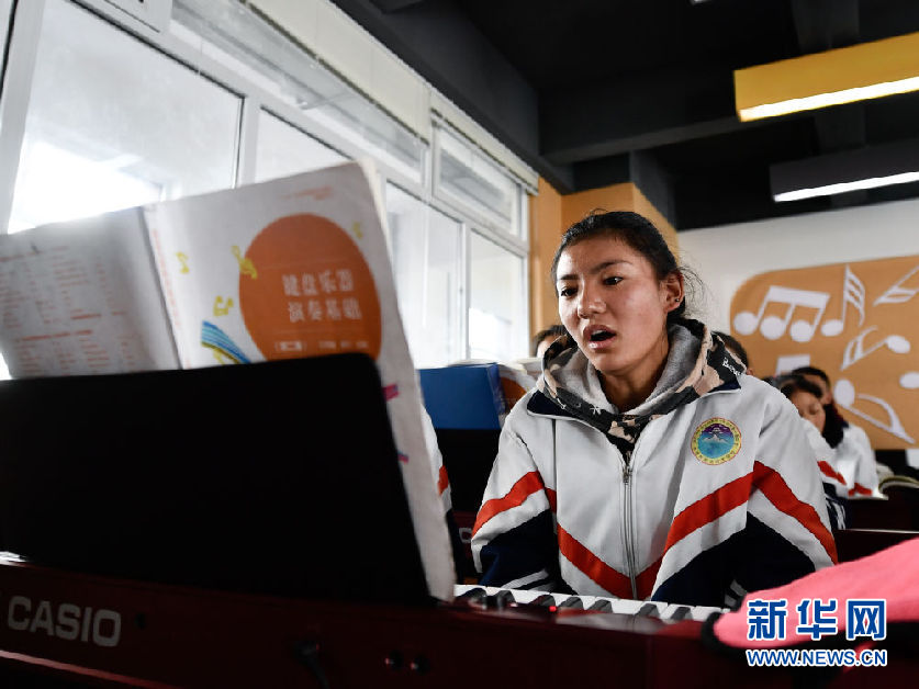 3月16日,在果洛藏族自治州職業(yè)技術(shù)學校,2020級學前教育專業(yè)學生楊央在上音樂課。新華社記者 張龍 攝