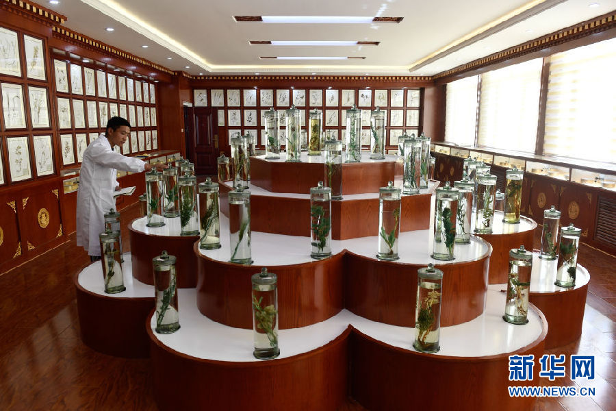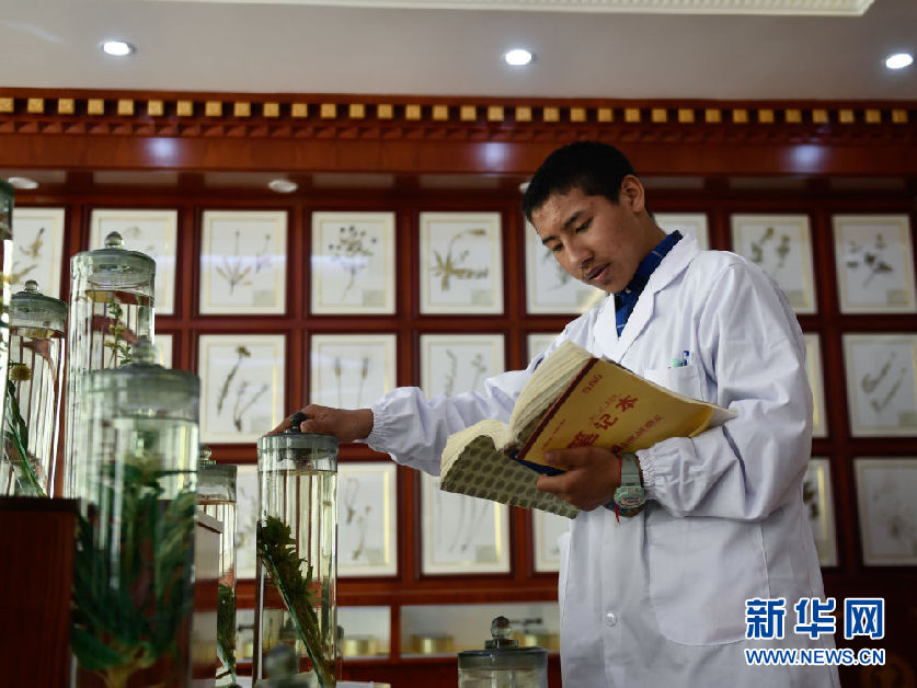 3月16日,在果洛藏族自治州職業(yè)技術(shù)學校,2020級藏醫(yī)醫(yī)療與藏藥專業(yè)學生華旦在草藥標本館內(nèi)辨認藥材。新華社記者 張龍 攝