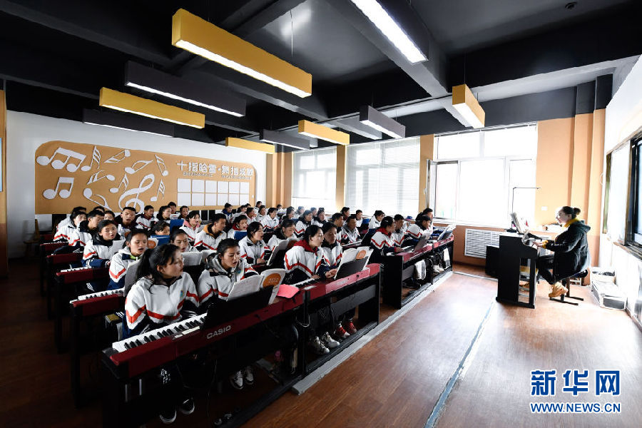 3月16日,在果洛藏族自治州職業(yè)技術(shù)學校,2020級學前教育專業(yè)學生在上音樂課。新華社記者 張龍 攝