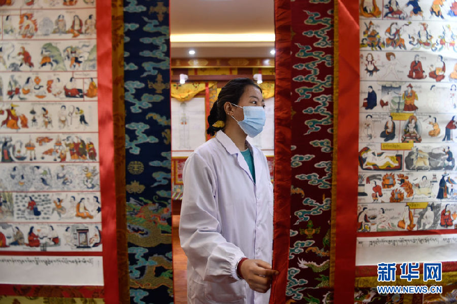 3月16日,在果洛藏族自治州職業(yè)技術(shù)學校,2020級藏醫(yī)醫(yī)療與藏藥專業(yè)學生才讓措通過藏醫(yī)典籍唐卡學習。新華社記者 張龍 攝