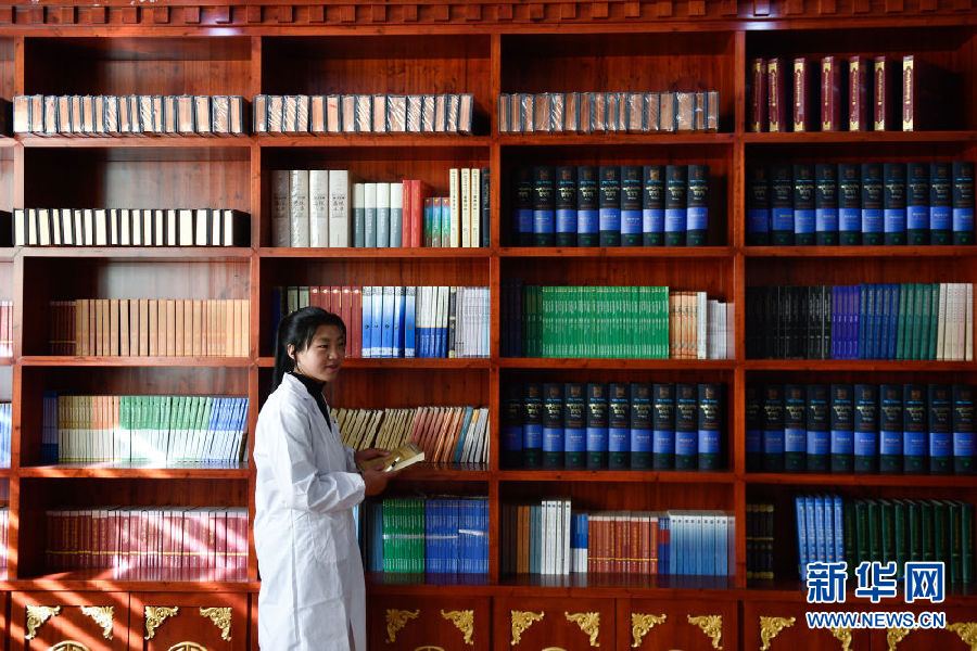 3月16日,在果洛藏族自治州職業(yè)技術(shù)學校,2020級藏醫(yī)醫(yī)療與藏藥專業(yè)學生德吉在借閱書籍。新華社記者 張龍 攝