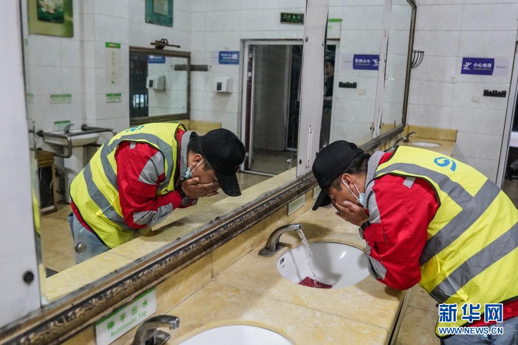 7月20日深夜,在河北保定服務(wù)區(qū)休息時,司機(jī)蘆艷會在衛(wèi)生間洗臉。新華社記者 彭子洋 攝