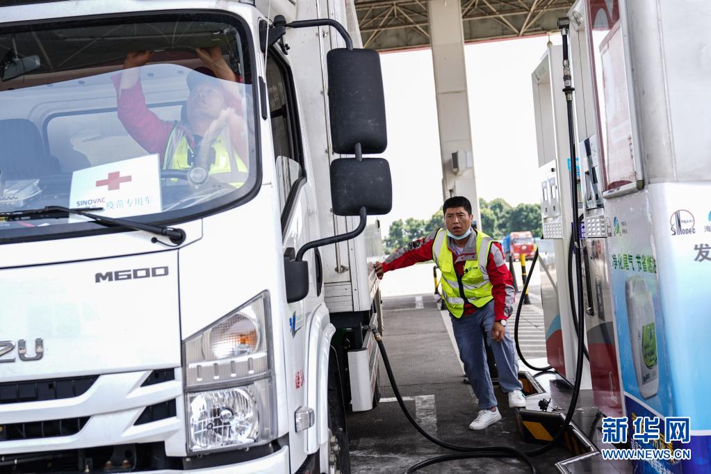 7月22日,在運(yùn)送疫苗途中,司機(jī)蘆艷會在加油站給車加油。新華社記者 彭子洋 攝