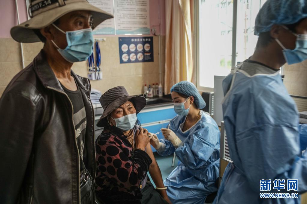 7月24日,在四川甘孜州稻城縣疫苗接種點(diǎn),當(dāng)?shù)厝罕娫诮臃N疫苗。新華社記者 彭子洋 攝