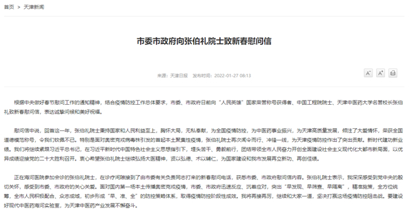 天津市委市政府向張伯禮院士致新春慰問信:胸懷大局,無私奉獻