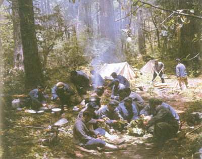 圖為書中插圖:考察隊(duì)員在林間宿營(yíng)地做早餐。