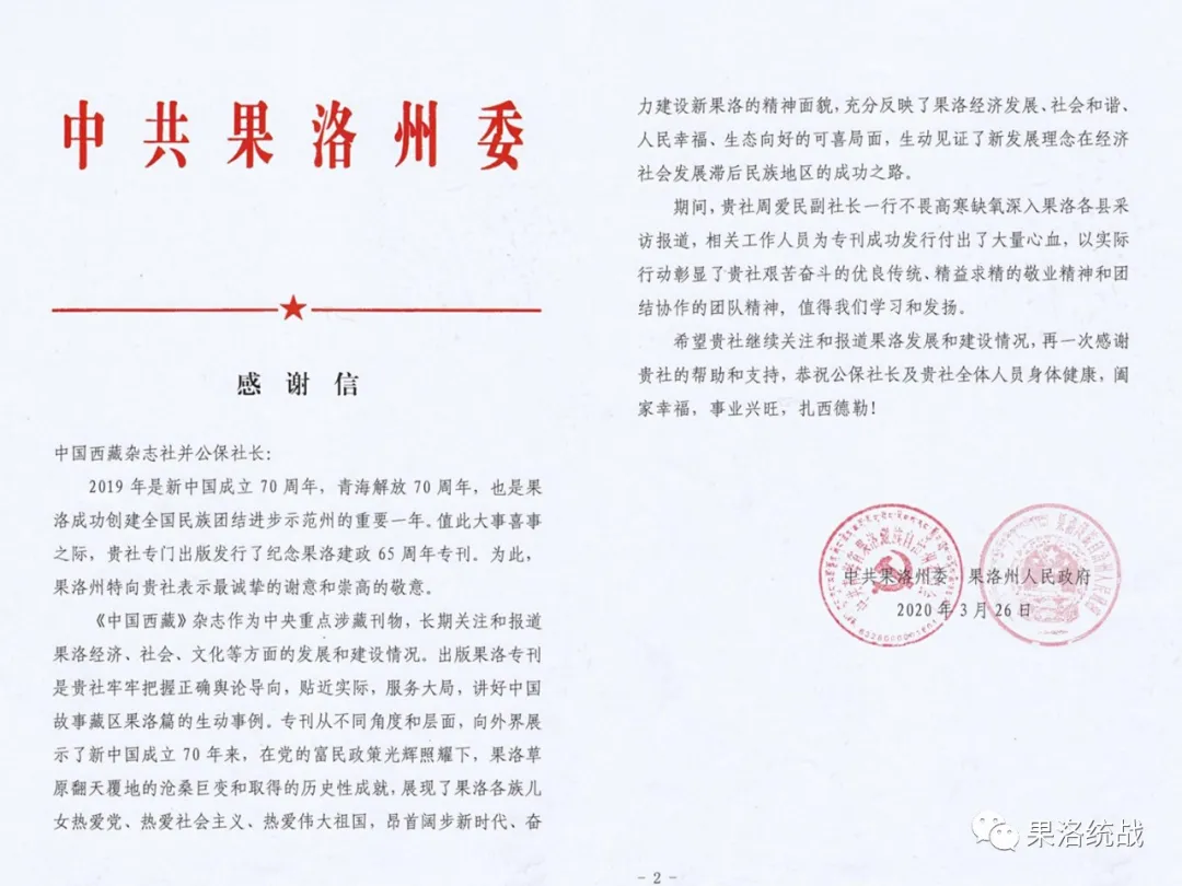 中國西藏網(wǎng)訊 3月26日,中共果洛州委、州人民政府致信中國西藏信息中心,對中國西藏信息中心推出果洛藏族自治州建政65年《中國西藏》雜志專刊表示感謝。